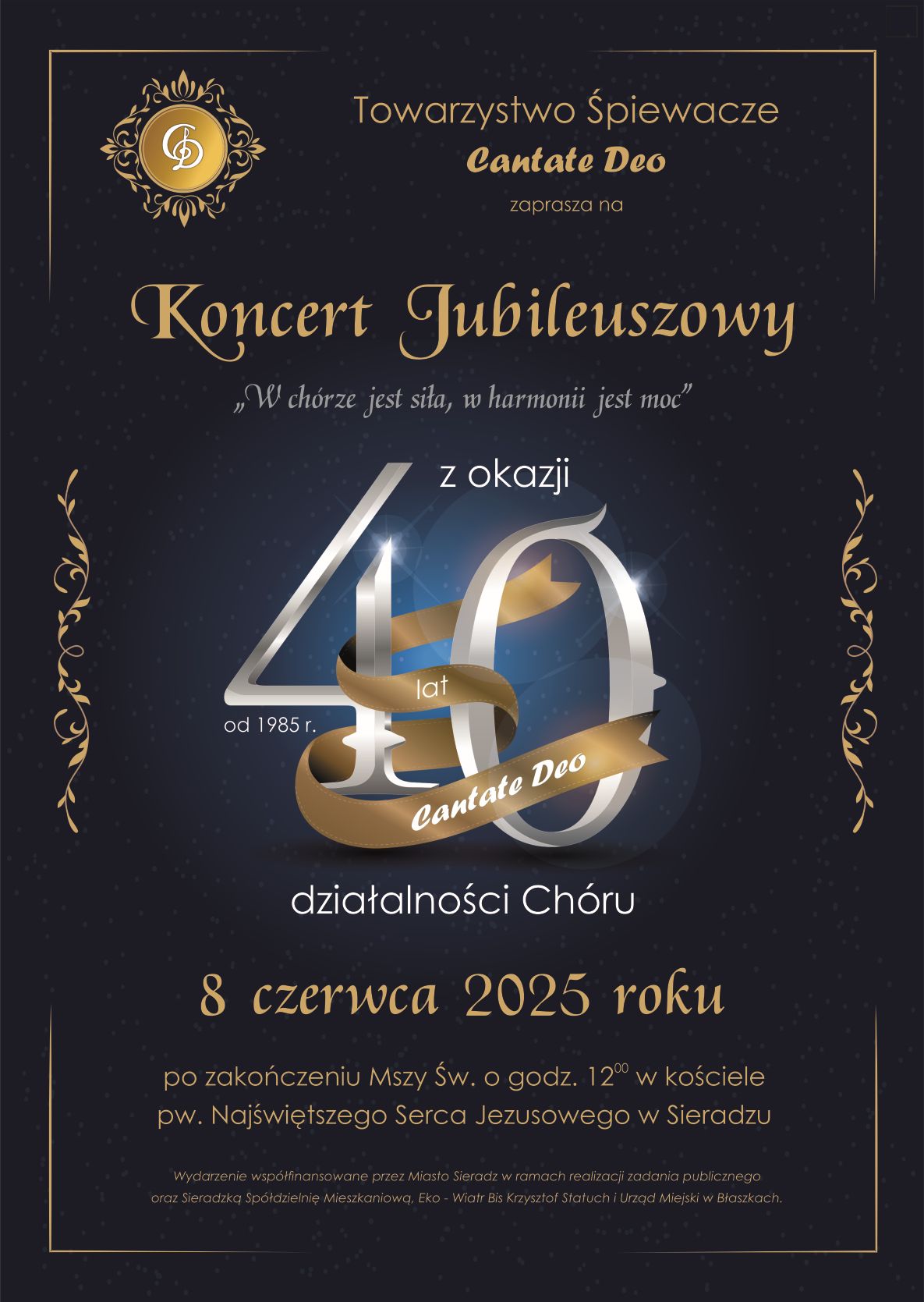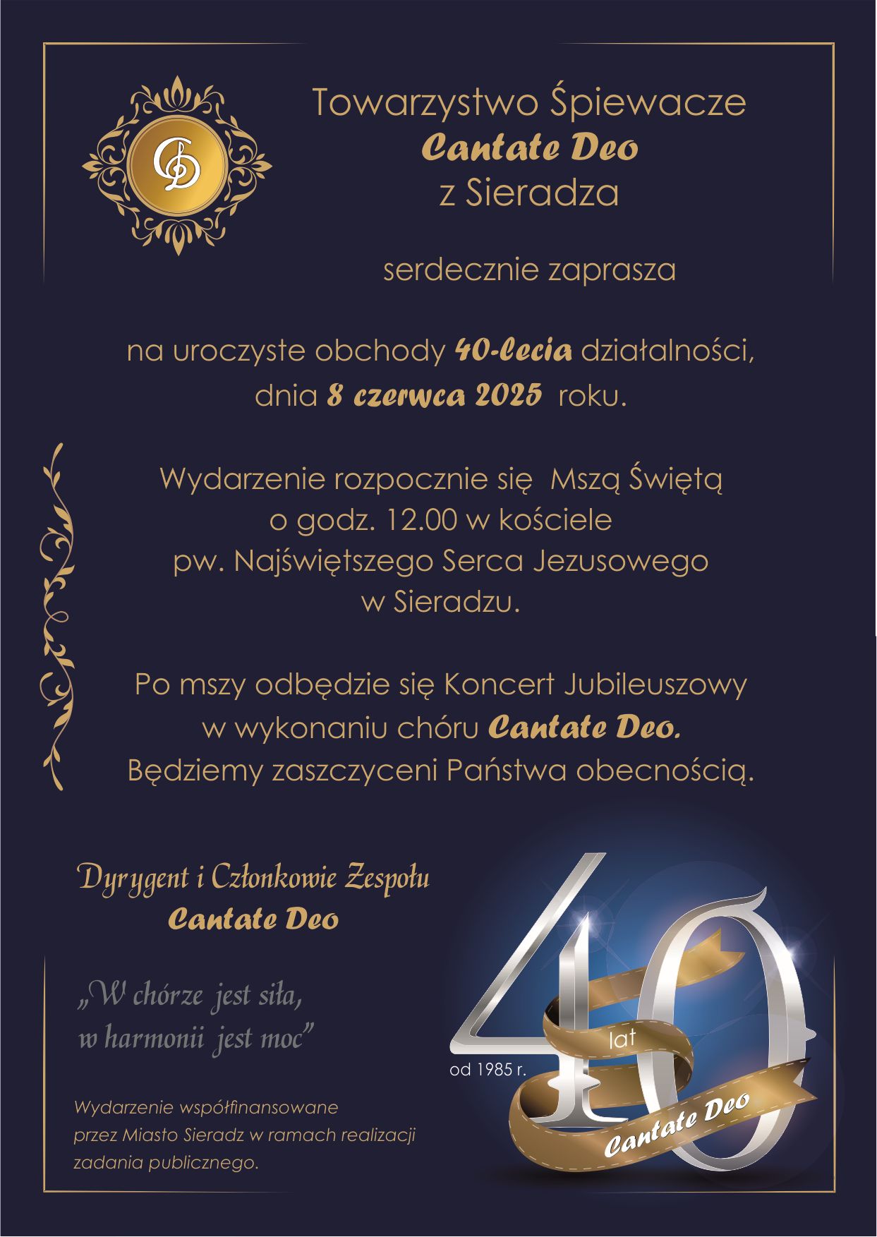 Chór "Cantate Deo" działa od 40 lat przy parafii p.w. NSJ w Sieradzu. Uczestniczy w uroczystościach religijnych oraz w ważnych wydarzeniach kulturalnych i społecznych. Skupia miłośników muzyki gotowych poświęcić swój czas dla kultywowania tradycji śpiewu, ubogacania życia kulturalnego w środowisku, krzewienia kultury chrześcijańskiej i narodowej.