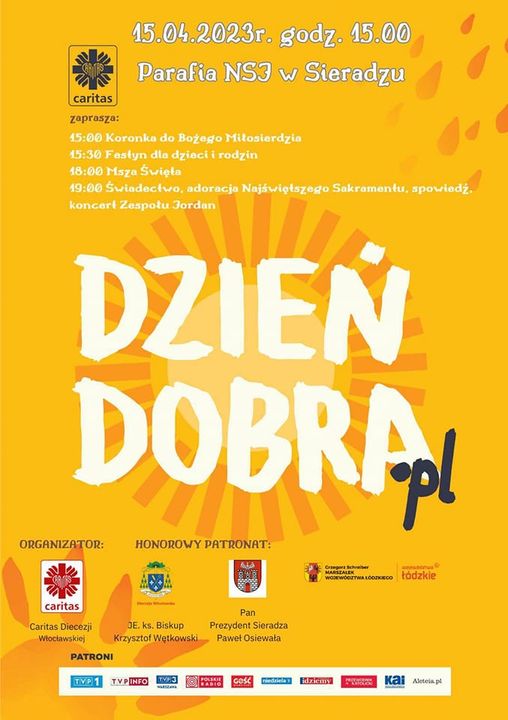 4. W sobotę zapraszamy do nas na "Dzień Dobra" organizowany przez Caritas. Rozpoczniemy świętowanie Koronką do Bożego Miłosierdzia w Kościele o godz. 15:00, po niej festyn dla dzieci i rodzin z wieloma atrakcjami: zabawy dla dzieci, zamek zabaw, malowanie buziek, motocykliści, ciasto, kawa, herbata, grochówka wojskowa, straż pożarna i wiele innych. Po festynie Msza Święta o godz. 18:00, następnie świadectwo, koncert, adoracja Najświętszego Sakramentu oraz możliwość spowiedzi. Ofiary zbierane do puszek przy tym wydarzeniu będą przeznaczone na utworzenie Centrum Pomocy Perinatalnej w Sieradzu, polegające na wieloaspektowym rodzaju opieki nad rodzicami, którzy oczekują na narodziny ciężko chorego dziecka.
