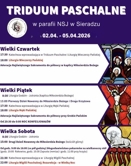 7. W Wielką Sobotę o godz. 8:30 Jutrznia – modlitwa brewiarzowa. Od godz. 9:00 do 16:00, co pół godziny błogosławieństwo pokarmów na stół wielkanocny. Tradycyjnie w naszej parafii ofiary składane przy tej okazji są przeznaczone na zakup paliwa do ogrzewania kościoła na przyszły sezon. W terenie błogosławieństwo o godz. 10:00 w Rakowicach, o 10:30 w Zapuście Wielkiej, a o g. 11:00 w Małej. O godz. 15:00 II dzień Nowenny przed Uroczystością Miłosierdzia Bożego. O godz. 16:00 nabożeństwo pierwszej soboty miesiąca: piętnastominutowa medytacja przy Grobie Chrystusa i część bolesna różańca świętego. Centralnym punktem Triduum będzie Liturgia Wigilii Paschalnej - Rezurekcja wraz z procesją rezurekcyjną o godz. 22:00 w Wielką Noc. Zapraszamy ministrantów i asystę procesyjną. Pół godziny przed każdą liturgią Triduum katecheza wprowadzająca.