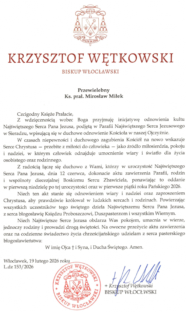 8. W ostatnich miesiącach tysiące ludzi w Polsce dokonało aktu poświęcenia siebie i rodzin Najświętszemu Sercu Pana Jezusa oraz przyjęło Tarczę NSPJ. Dzieło to rozpoczęło się od parafii NSPJ w Starej Miłosnej, gdzie dokonał się cud uzdrowienia chorego. Później dzieło to dokonało się w Krakowie w parafii NSPJ i Kończyskach w klasztorze Sióstr Bernardynek. Do tej inicjatywy została zaproszona także nasza parafia Najświętszego Serca Jezusowego - a więc my wszyscy. Główna uroczystość Wielkiego Zawierzenia Najświętszemu Serca Pana Jezusa będzie miała miejsce w uroczystość Najświętszego Serca Pana Jezusa, 12 czerwca o godz. 18:00, pod przewodnictwem Księdza Biskupa. Będzie też możliwość dokonania tego aktu Zawierzenia w niedzielę po tej uroczystości na każdej Mszy świętej i przyjąć Tarczę NSPJ - znak miłości i opieki Serca Jezusowego. Również będzie to można uczynić we wszystkie pierwsze piątki miesiąca - na nabożeństwie o godz. 7:00, 16:30 i 18:00. Szczegóły na plakacie oraz ulotkach wystawionych przy wejściach do kościoła.